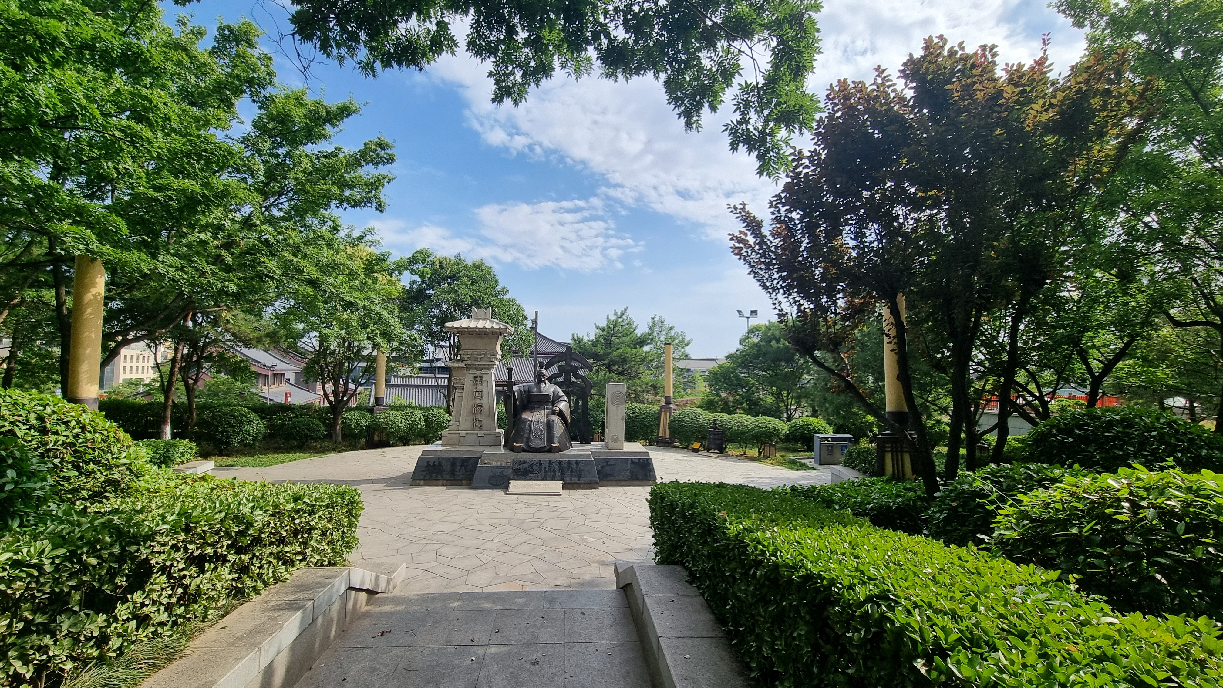 화청궁으로 이동하며 왼쪽 도로 아래로 화천궁을 설계한 사람의 동상이 있고