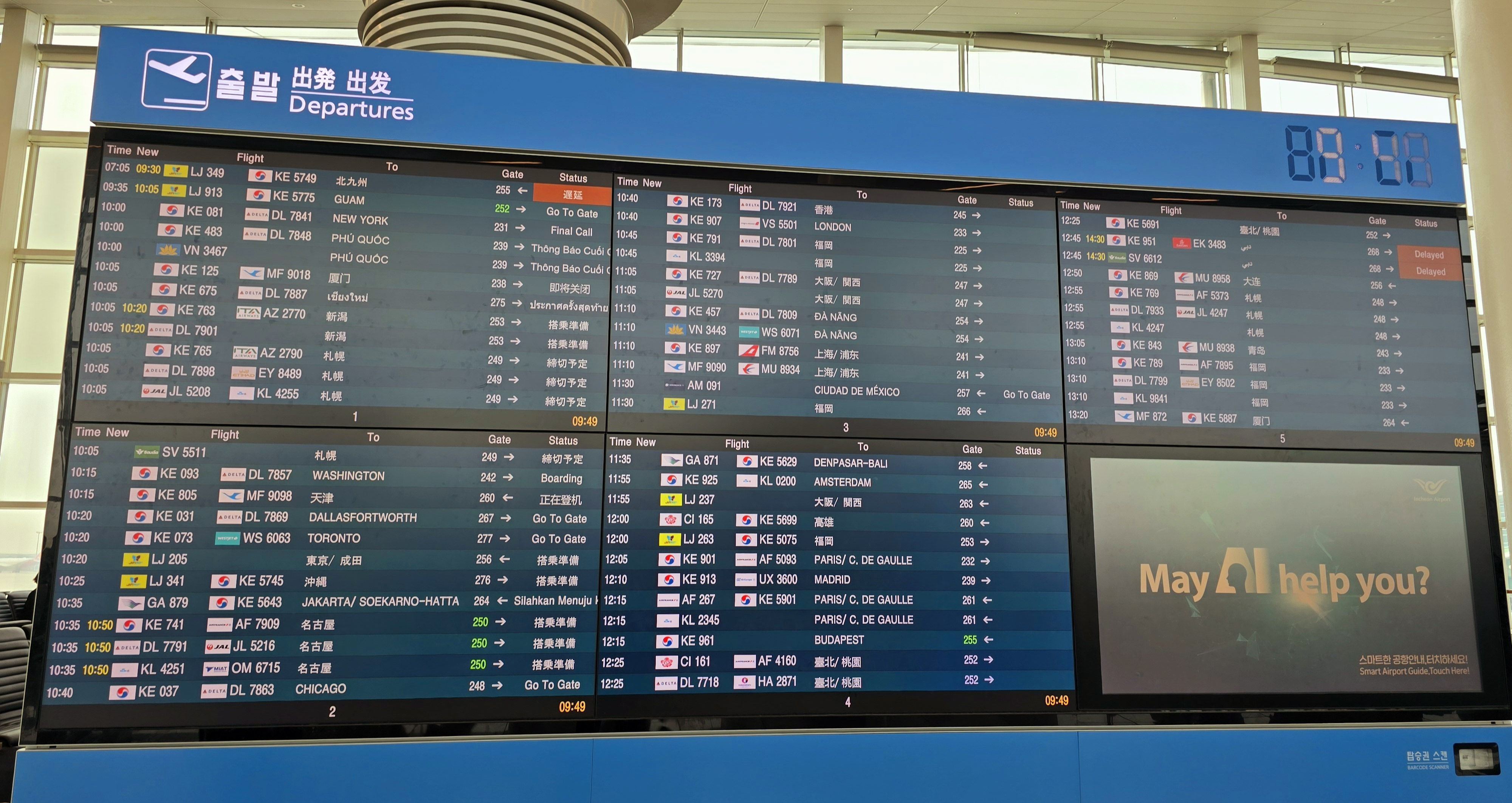 인천국제공항 제2터미널 3층 K카운터 여행이지 투어 미팅테이블 앞에서 가이드 미팅후 전달사항 받고 전광판 부터 확인하고