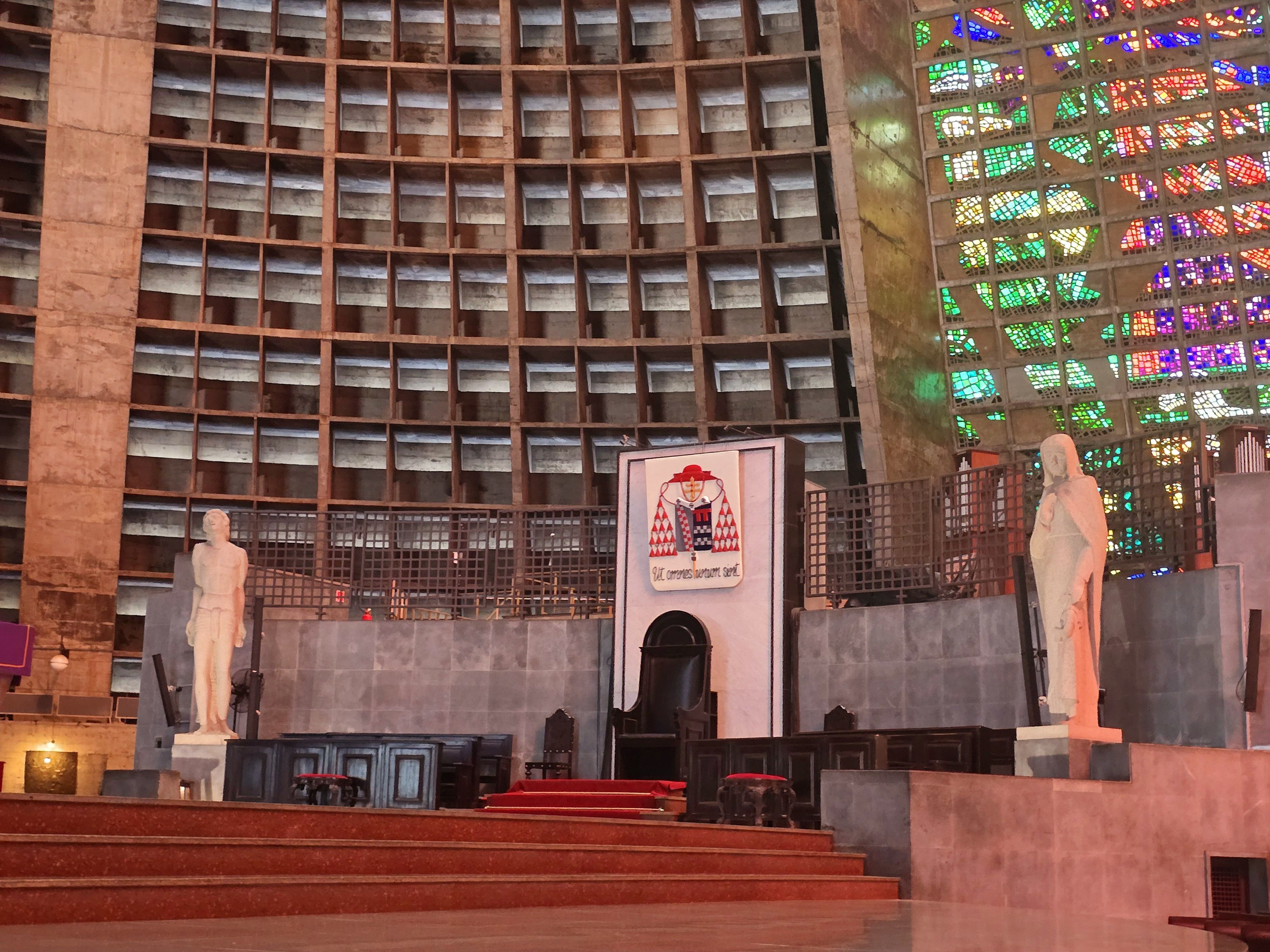 아름다운 스테인글라스와 독특한 구조로 유명한 원추형으로 생긴 독특한 건물 디자인으로 얼핏 보면 성당으로 보이지 않는다. 지름 104m, 내부높이 68m, 수용인원 2만 5000명이다. 천장까지 화려한 스테인드글라스와 위쪽에 매달아놓은 그리스도의 상이 매우 독특하다.