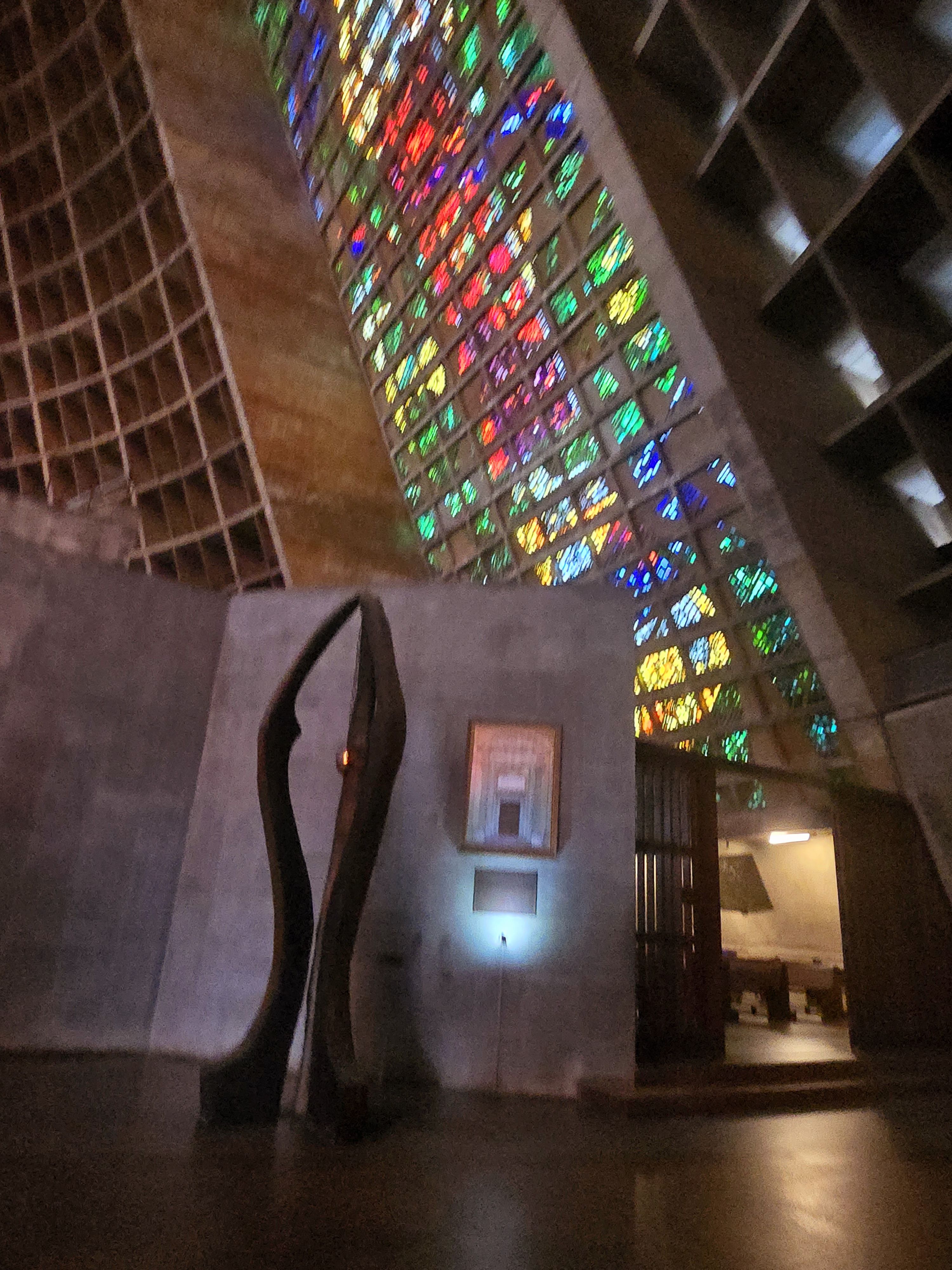 거대한 삼각형(정확히는 원뿔형) 구조, 60m에 이르는 웅장한 스테인드글라스, 그리고 현대적인 건축미까지 이 모든 요소가 결합되어 신비로운 느낌을 자아냈다.