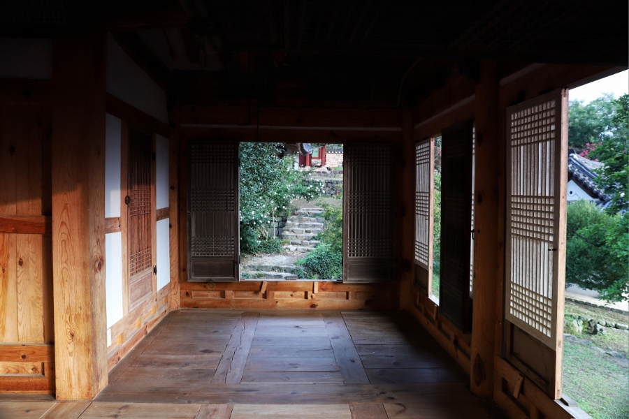 중앙 3칸의 대청을 사이에 두고 양 옆에 각각 1칸의 방을 꾸몄는데 문사이로 죽림재로 오르는 게단이 보인다.