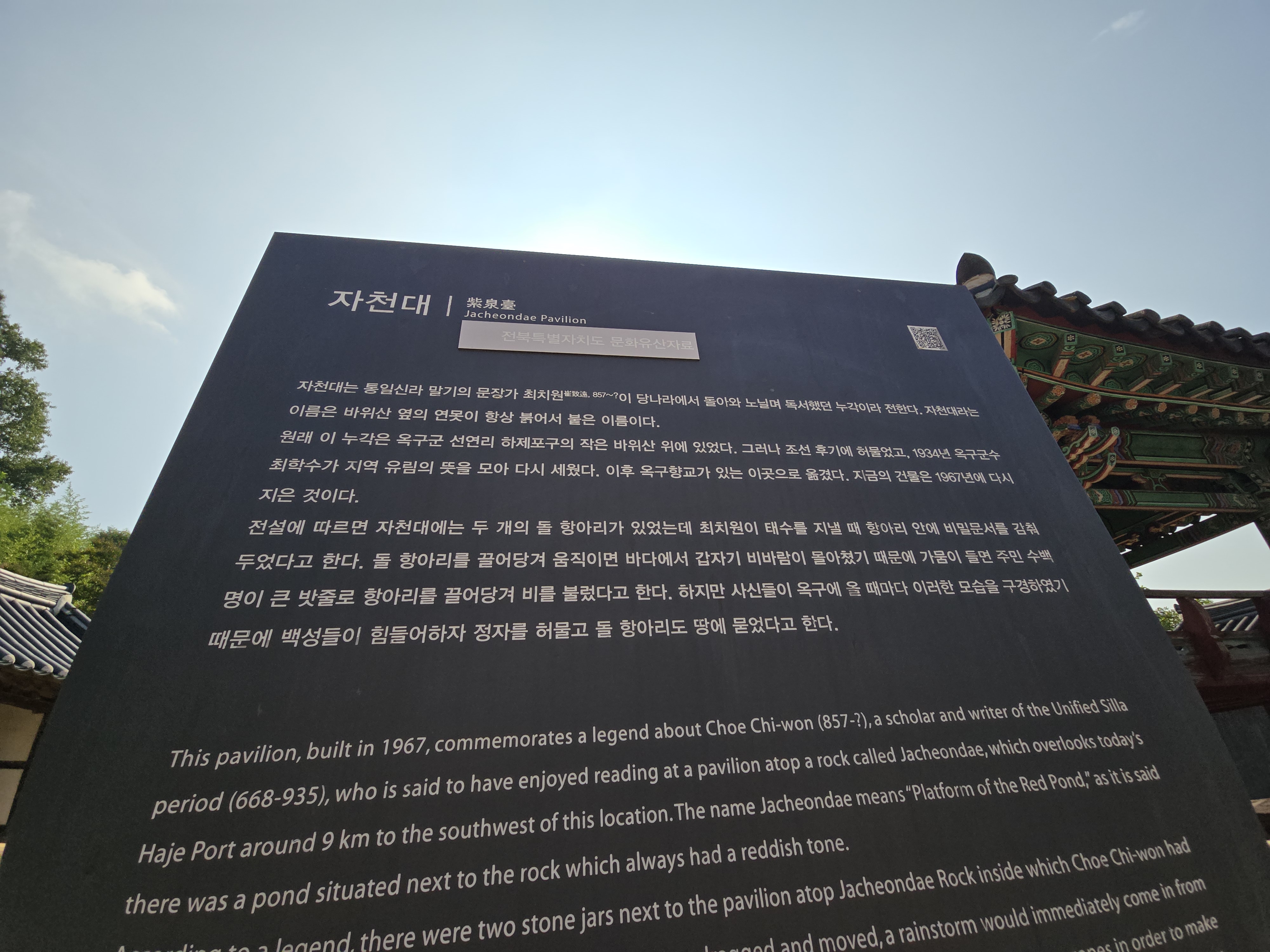 당나라에서 돌아왔을 때 세상의 인심이 어지럽고 어수선하자, 자천대에 올라 책을 읽으며 근심과 걱정을 달랬다고 하는 최치원 선생을 모신 사당인데 시호인 문창후를 서원명으로 쓴 것이다.