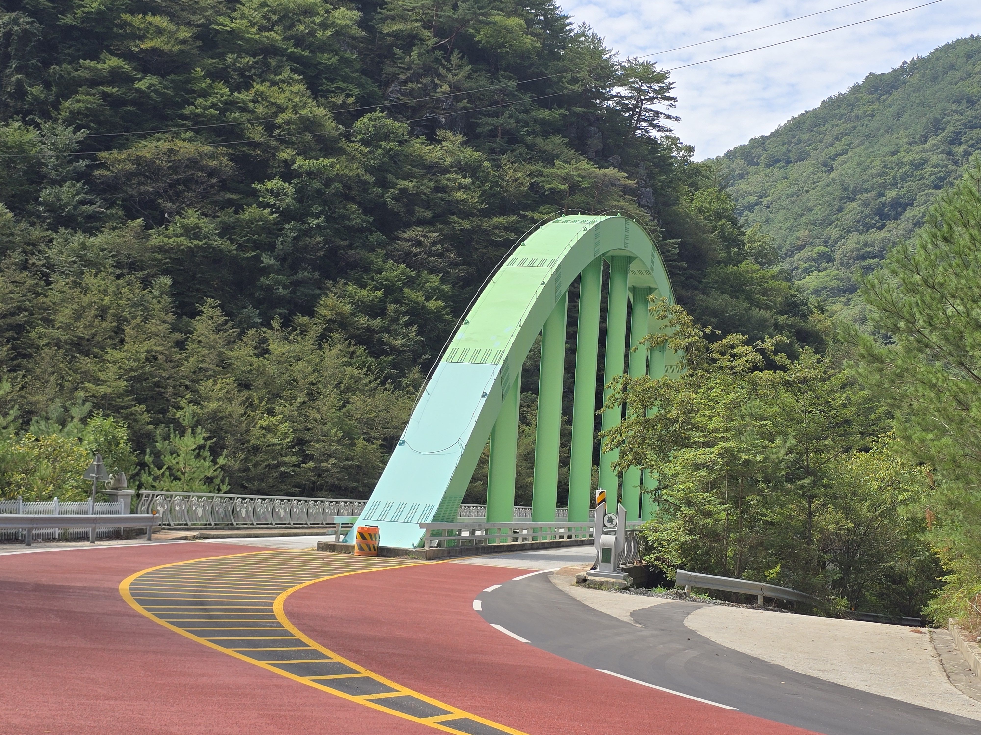 아우라지 입구의 강 건너편에 살던 처녀 총각이 불어난 물 때문에 서로 만나지 못하게 되었다는 설화를 바탕으로 한 조형물을 지나 410번 도로를 이용하여 송천 계곡을 따라 구불구불한 길을 천천히 달렸다. 길가에 주차장이 보였다.