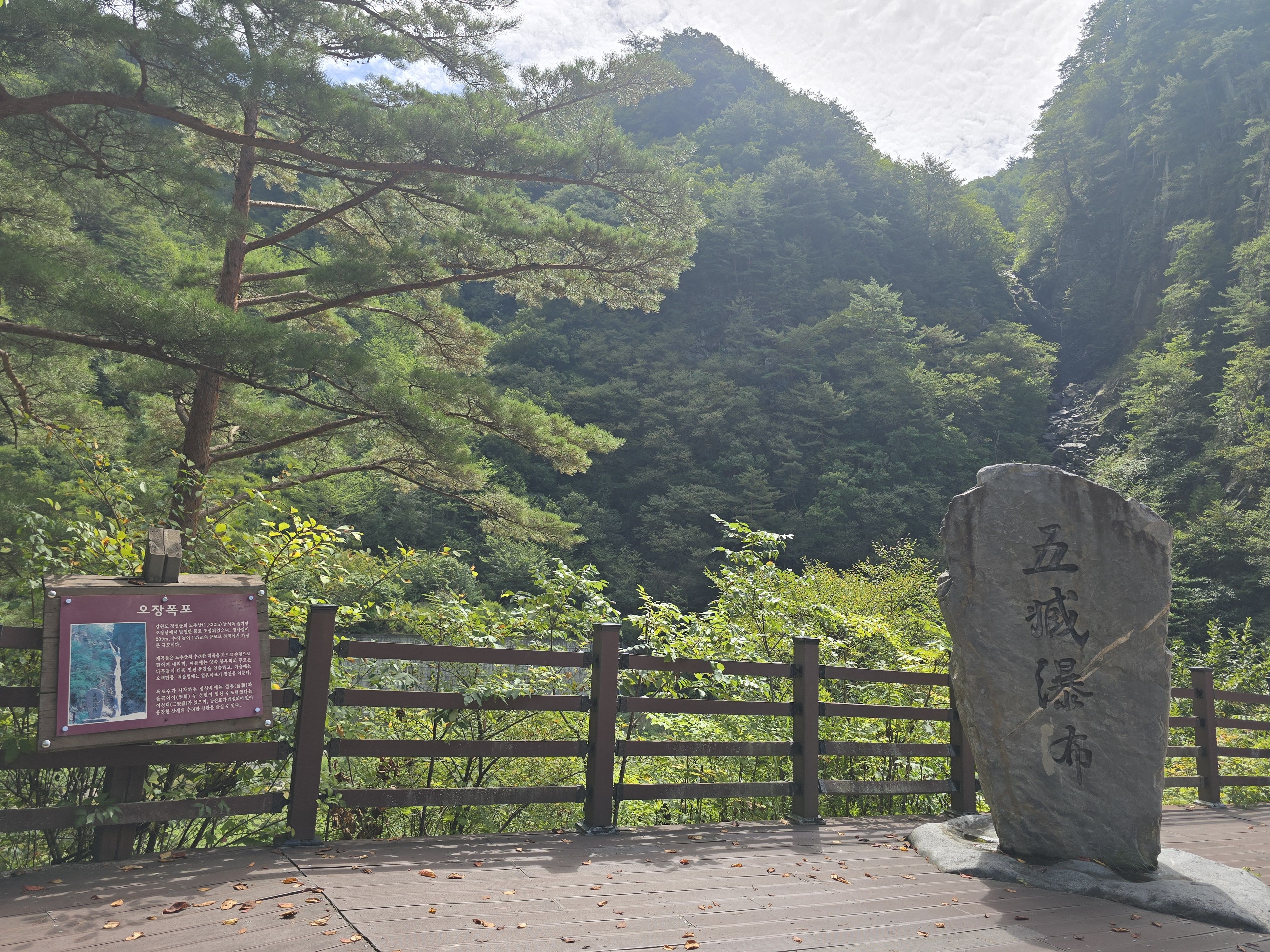 커다란 절벽 사이로 폭포가 시원스레 쏟아지고 있다. 오장폭포 비석이 보였다.