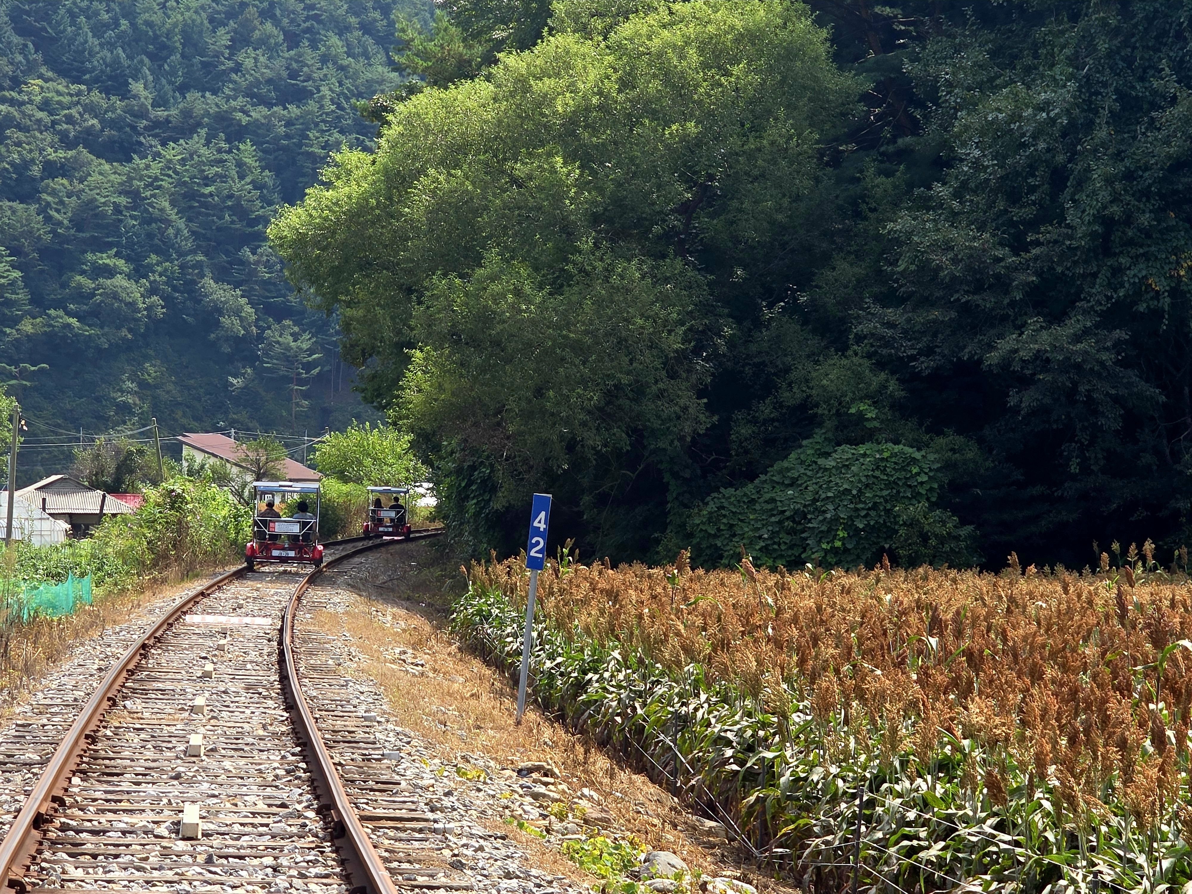 구절이역에서 레일바크 타고 아우라지역에 내려 풍경열차 타고 다시 구절리 역으로 7.2km를 돌아오는 코스로 1:30분 소요되었다.