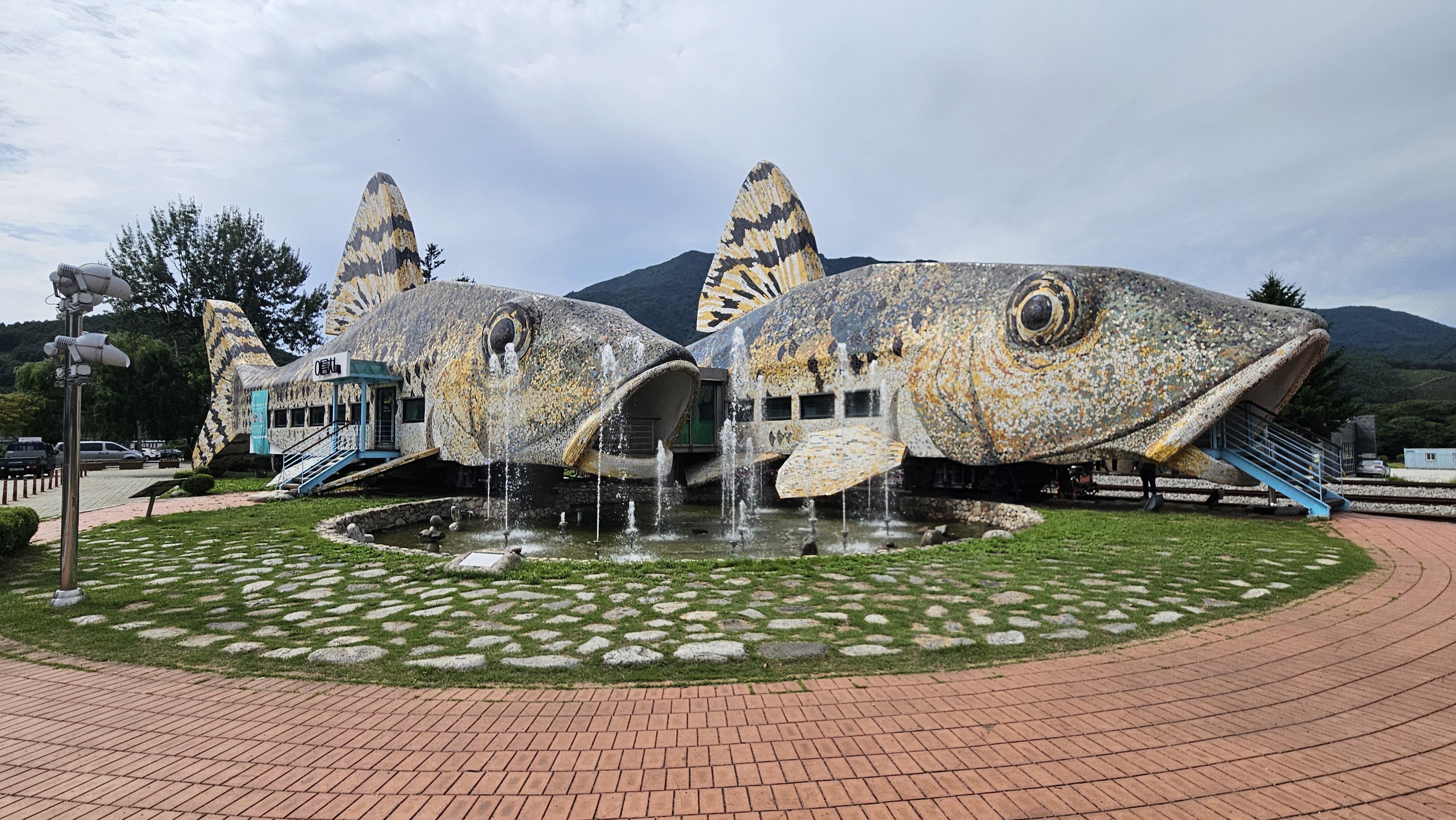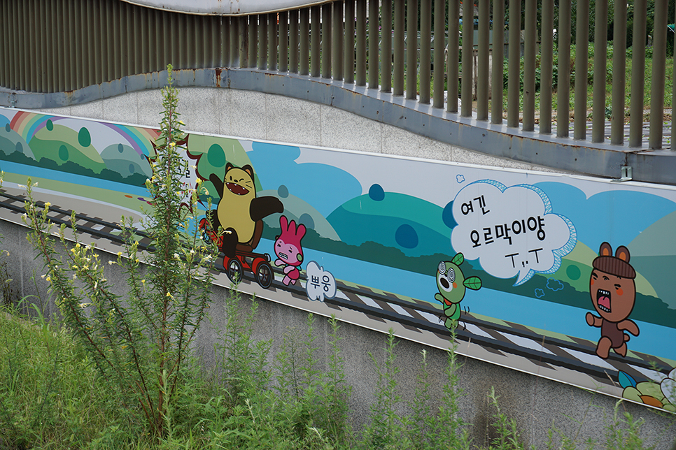 레일 위에 설치된 객차인데 폐기된 객차로 도서관과 문화휴게공간을 만들어 운영하는데 어름치의 형상이 이채롭다.