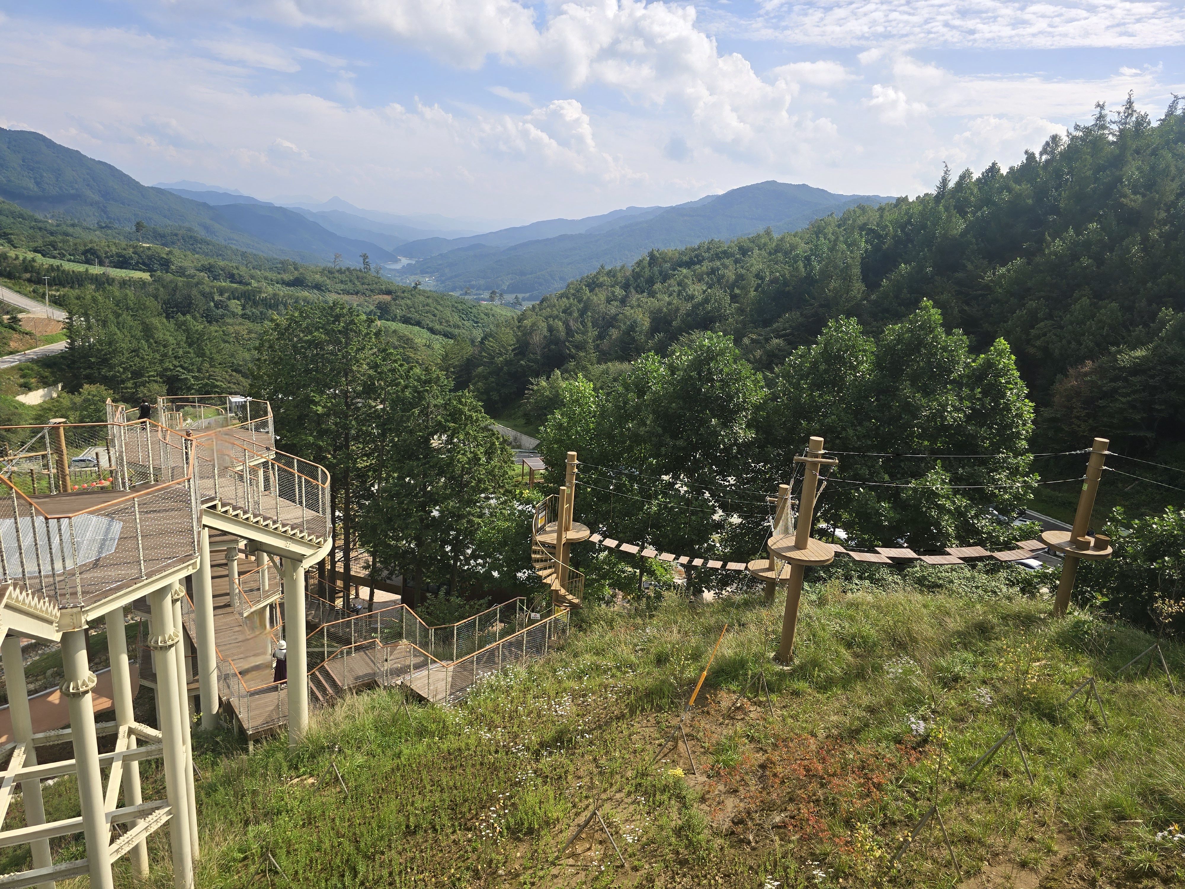 나무다리, 다양한 높이(5~10m) 장애물을 넘어 이동하는 체험식 어드벤처 코스로 3단계 난이도로 구성되어 있다.