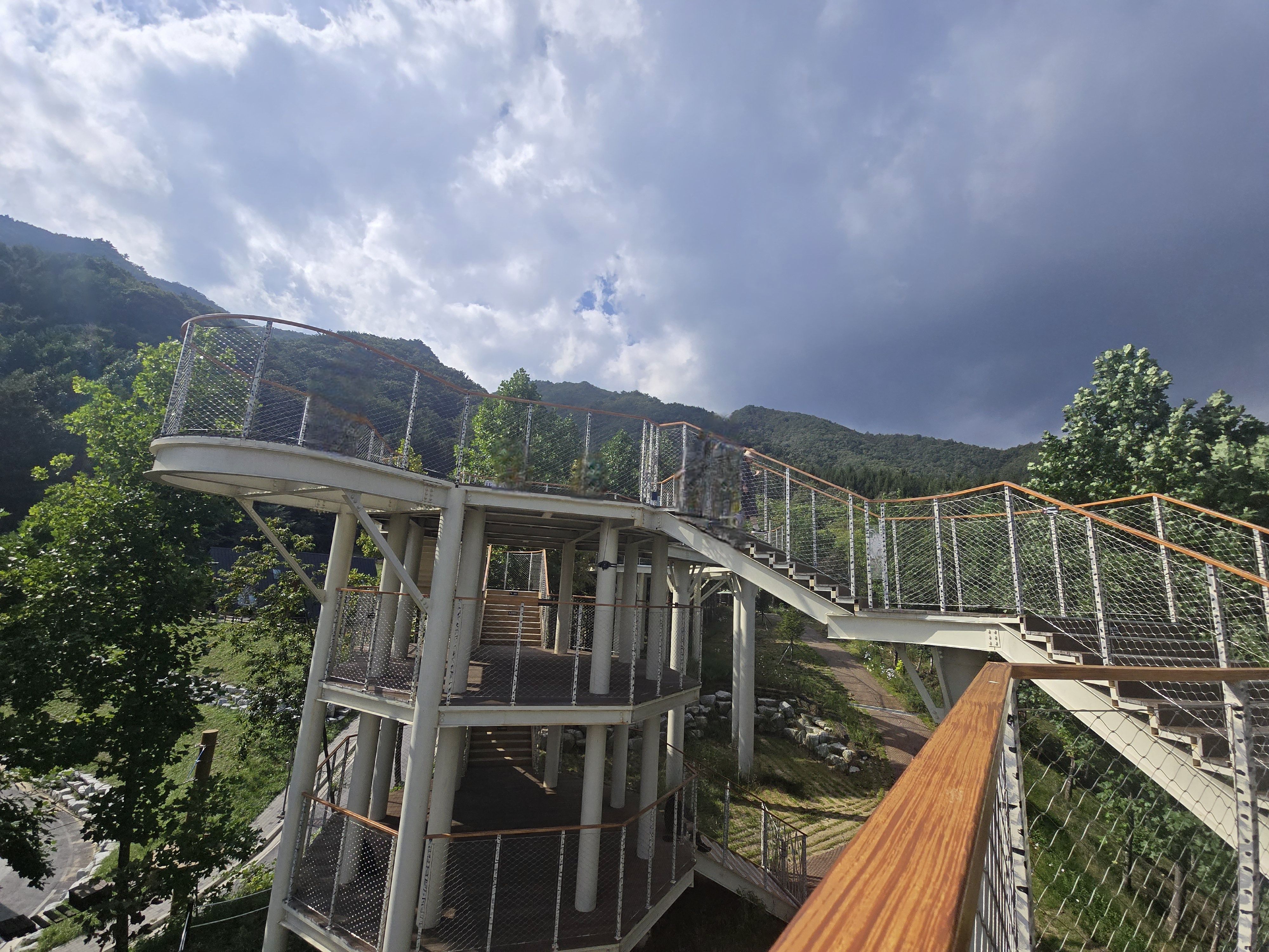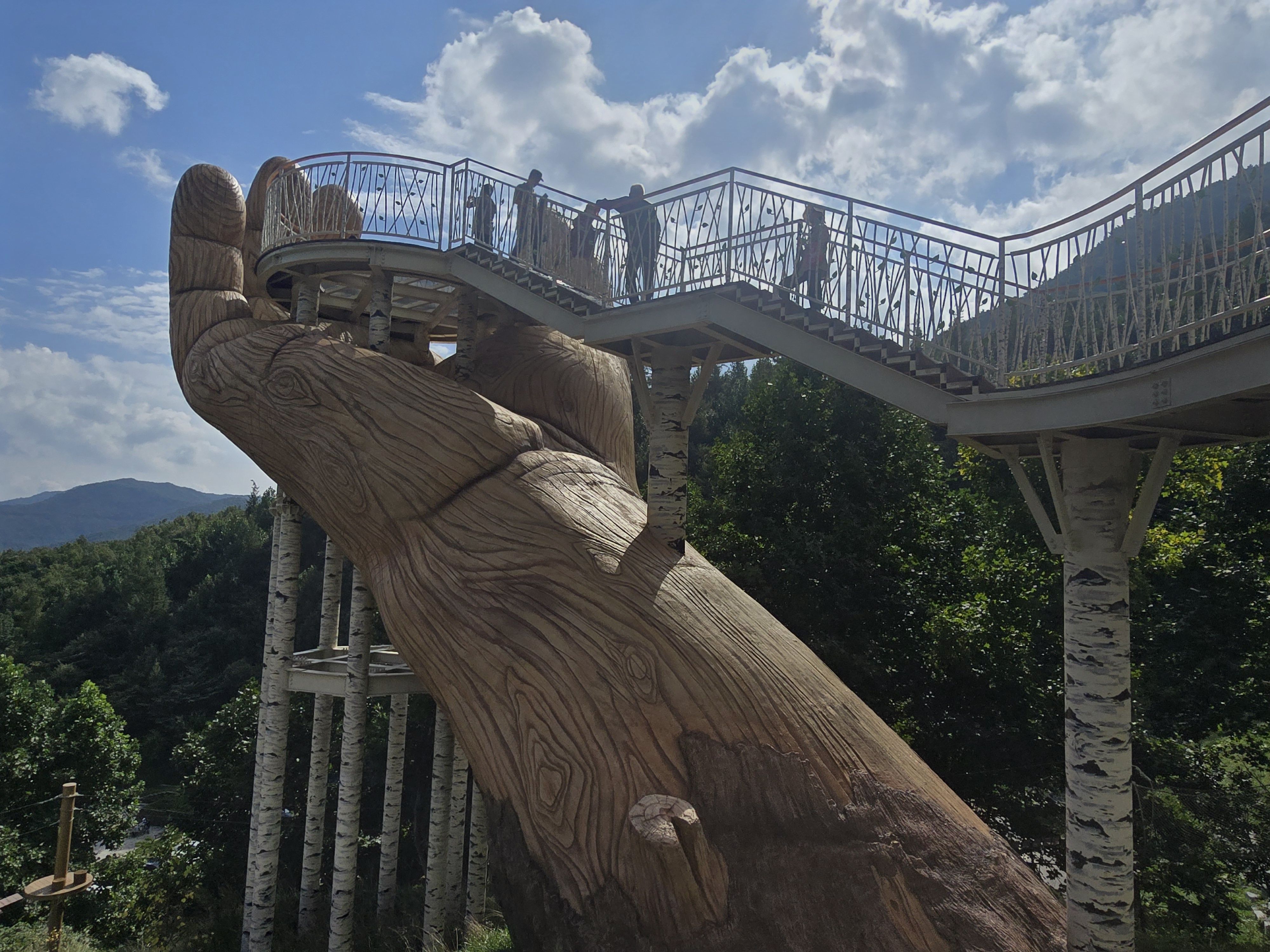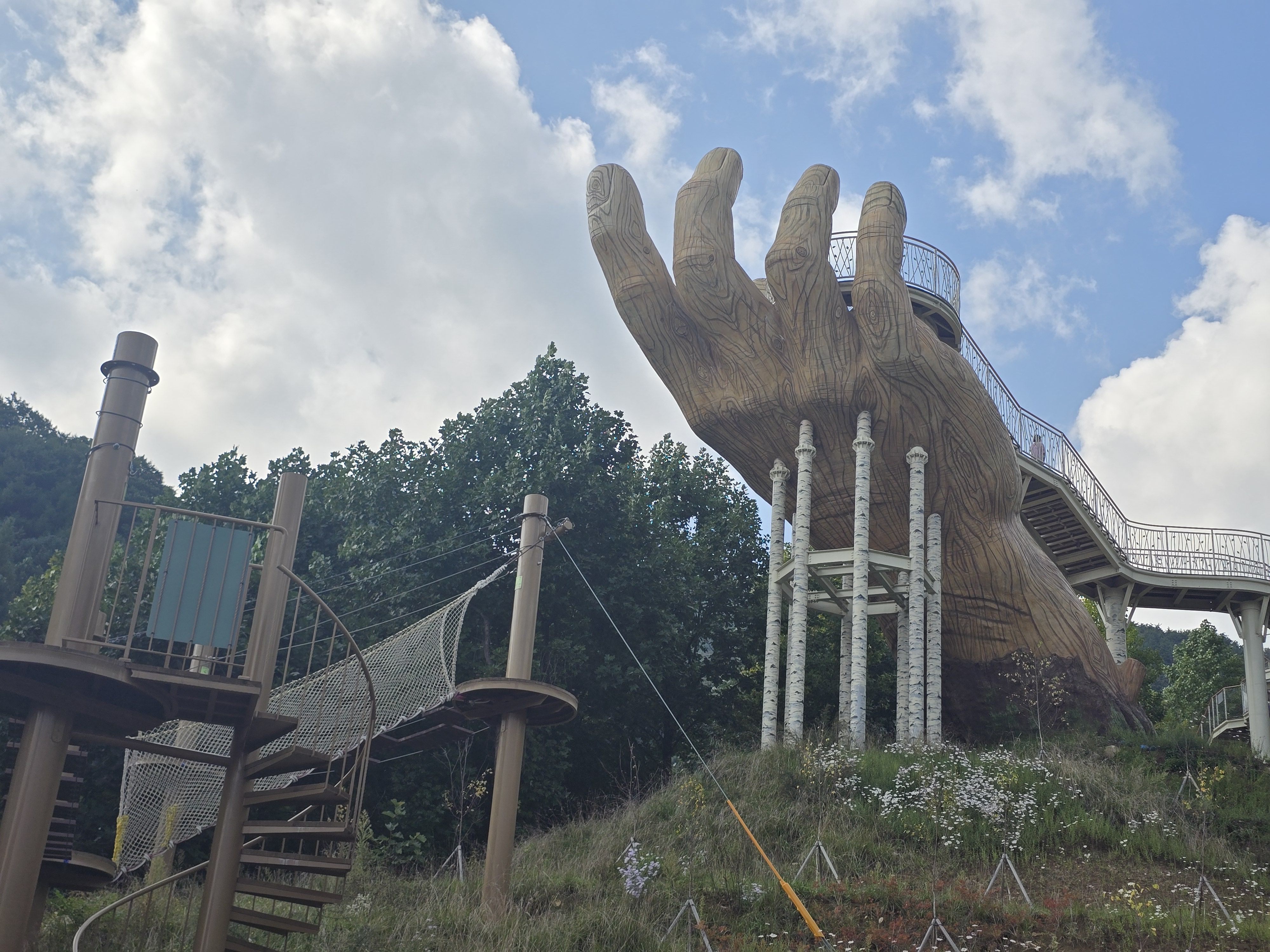 첫눈에 가장 시선을 사로잡는 건 역시 공중에 떠 있는 듯한 ‘라이트 핸드(Hand)’ 조형물이다. 마치 거대한 손이 산허리를 받치고 있는 듯한 모습이다. 이 조형물은 길이 133m의 트리탑 데크 전망대의 일부로, 백두대간의 능선을 따라 뻗은 산책길 끝에서 하늘을 향해 걸어가는 듯한 특별한 체험을 제공한다.