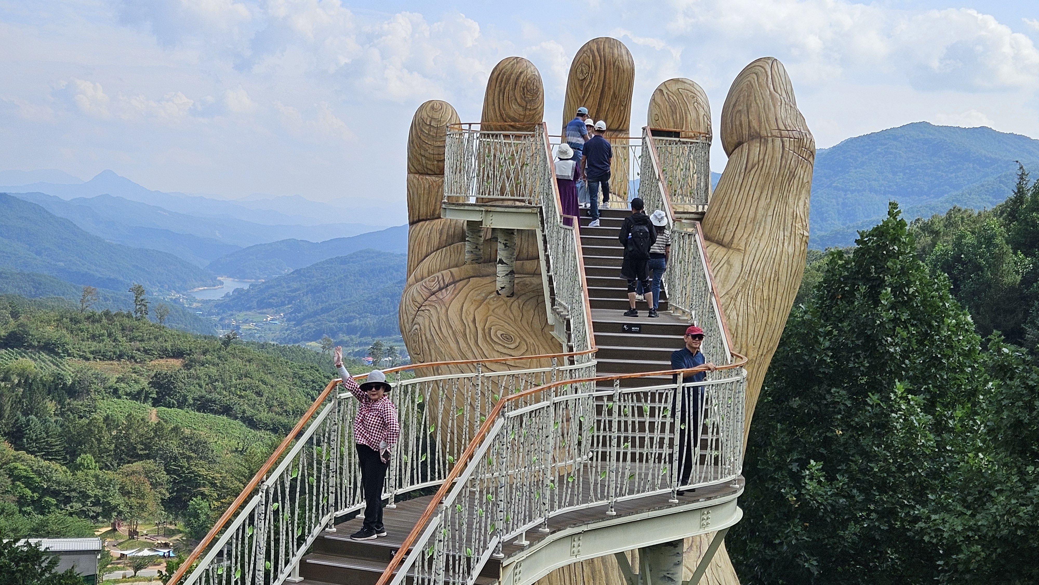 올라가는 동안 뒤를 돌아보면 거창 고제면의 초록빛 산세와 하늘이 한눈에 펼쳐진다. 손 모양 위에 서면, 아래로는 깊은 숲과 계곡이, 앞으로는 시야가 탁 트인 하늘이 펼쳐져 “이곳이 정말 한국이 맞나?” 싶을 만큼 이국적인 뷰를 만날 수 있다.