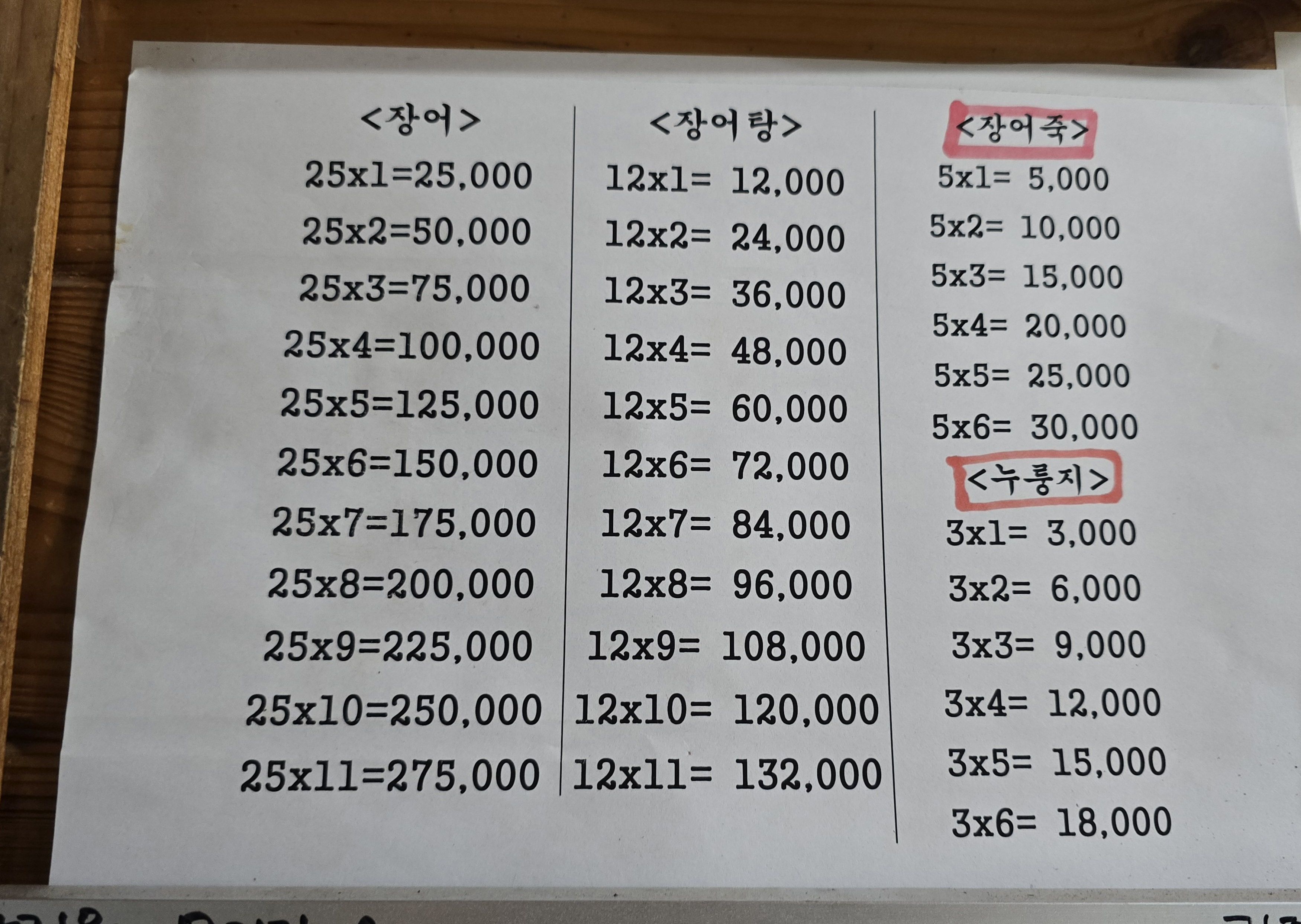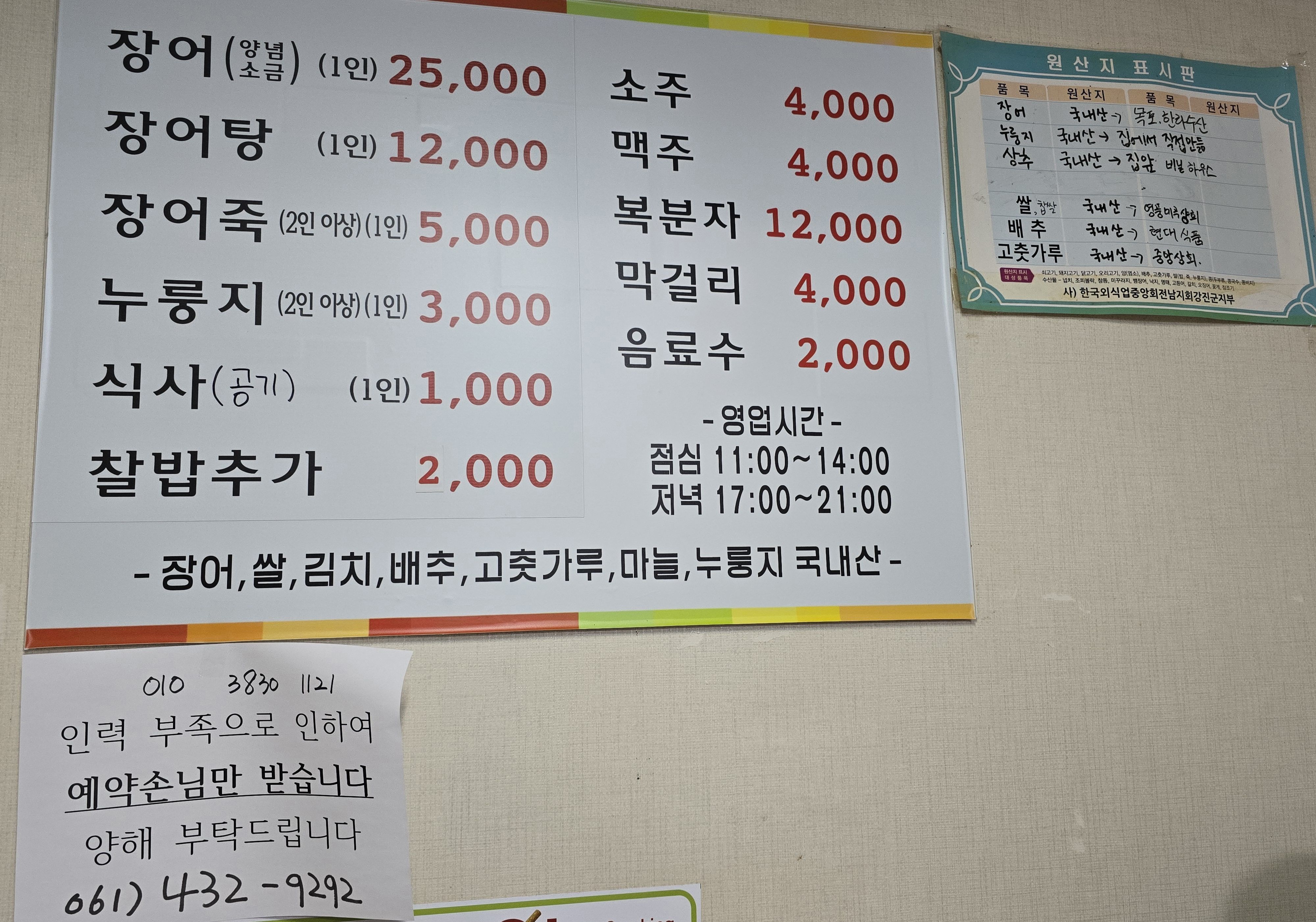 강진 목리장어센터 메뉴판