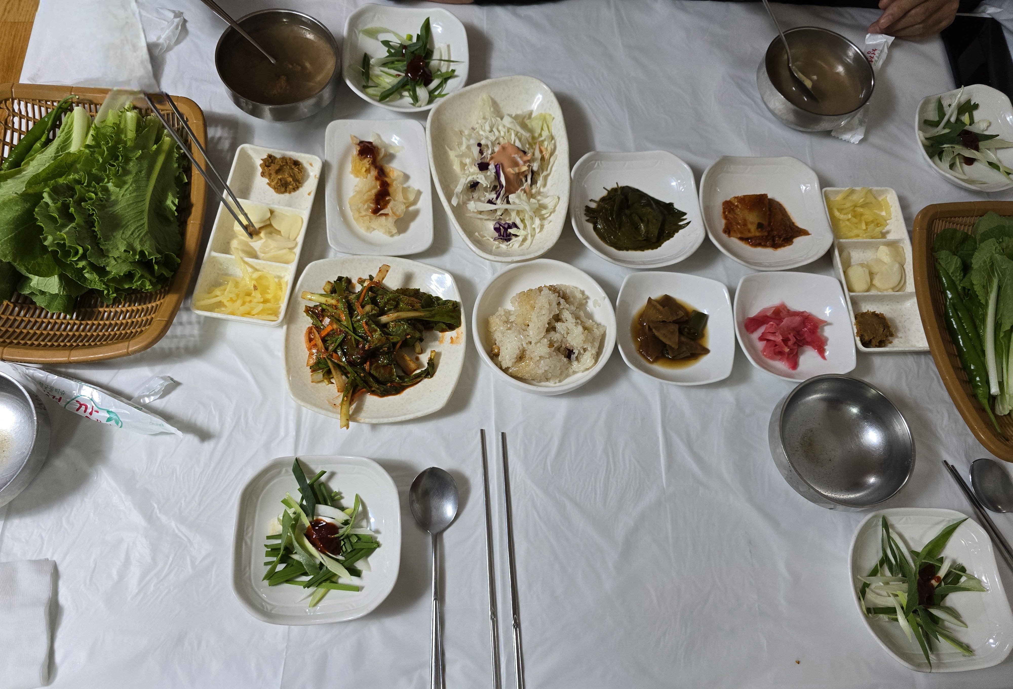 기본 밑반찬, 밑반찬으로 나온 찰밥이 넘 맛있다. 찰밥은 추가주문 가능하다.(추가 천원)
